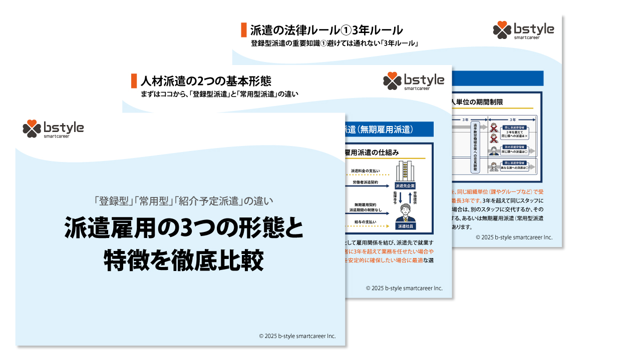 本資料では、派遣活用における3つの契約形態(登録型・常用型・紹介予定派遣)の違いや特徴を徹底比較し、自社に最適な人材活用方法を選ぶためのポイントを解説しています。