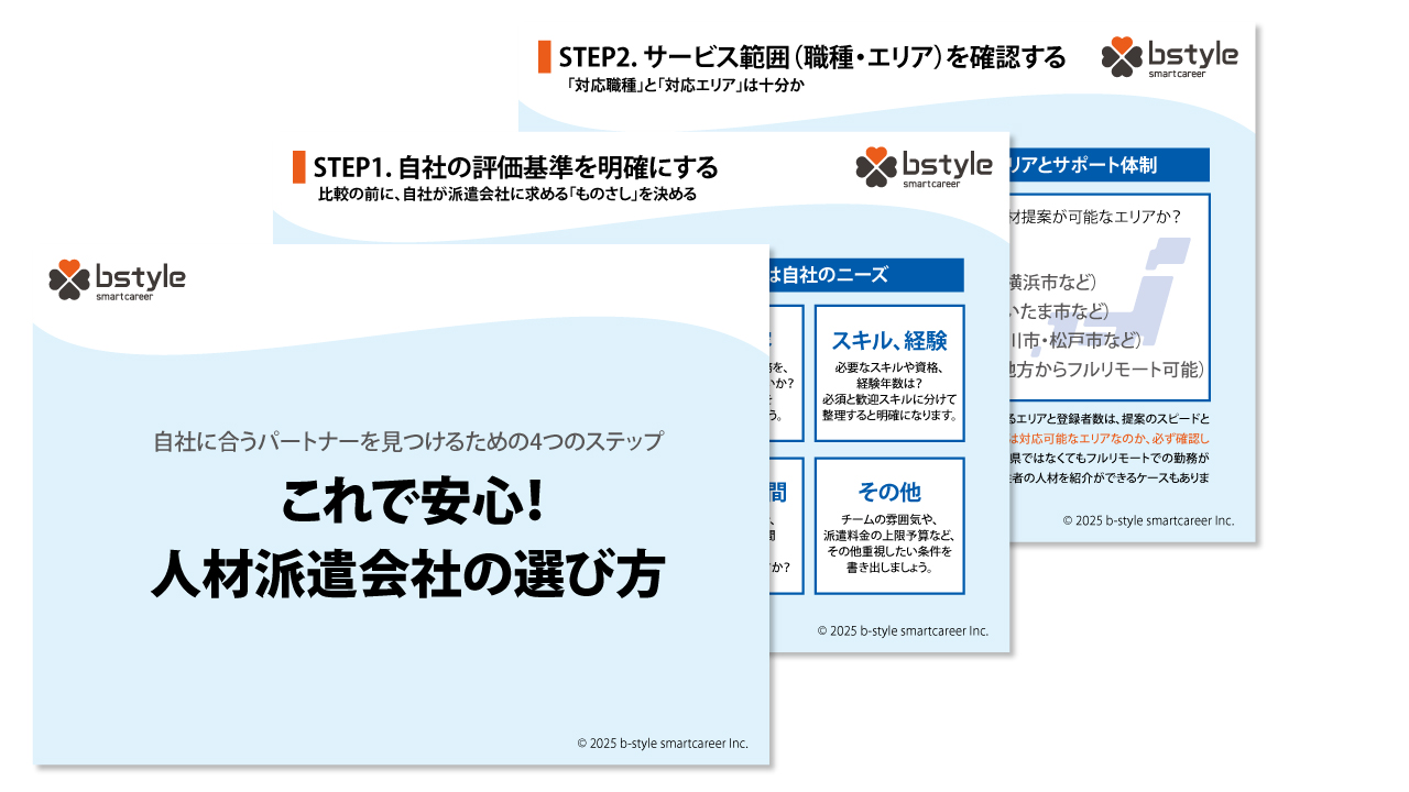本資料では、自社に最適な人材派遣会社を選ぶための4つのステップ(評価基準の明確化・対応業種の確認・実績評価・サポート体制の見極め)を、具体的なチェックポイントとともに解説しています。